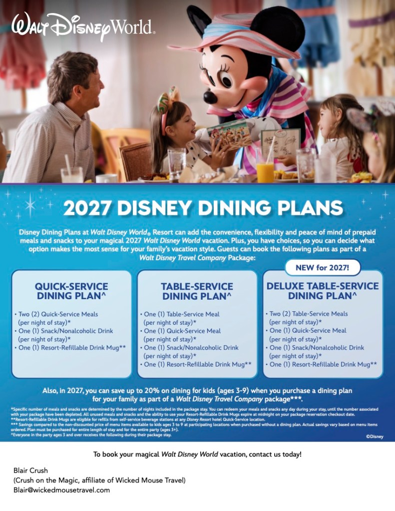 All it takes to secure a Walt Disney World vacation in 2027 is a $200 refundable deposit on a Walt Disney Travel Company vacation package! The best time is always as early as possible to ensure the room and resort of choice and current ticket pricing. As always, Walt Disney Travel Company vacation packages can be modified prior to your final payment. Thus, if a promotion becomes available for your travel times, your advisor (hopefully you’ve chosen me!) can automatically (I do this) adjust your package to the lowest possible package price based on your wishes and budget!